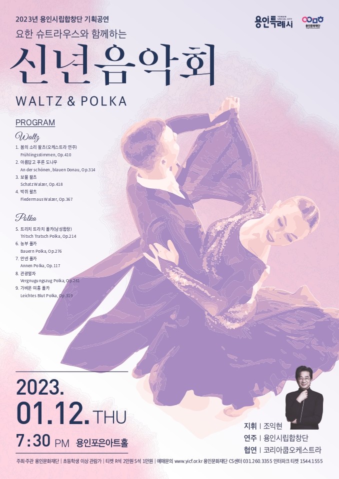 [용인=오왕석 기자] (재)용인문화재단(이사장 이상일) 용인시립합창단은 <요한슈트라우스와 함께하는 신년음악회 ‘왈츠&폴카’>를 2023년 1월 12일 오후 7시 30분에 용인포은아트홀에서 개최한다.