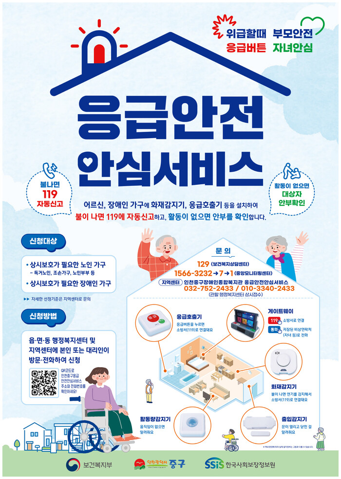 보건복지부와 인천 중구 등이 함께하는 응급안전안심서비스는 노인과 장애인 가정 내 정보통신기술(IoT) 기반의 장비를 설치해 응급상황 발생 시 119에 신속히 알려 구급·구조를 지원하는 사업이다.