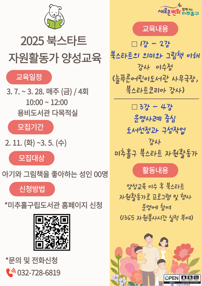 이번 모집은 아기와 그림책을 좋아하고 자원활동가에 관심 있는 사람은 누구나 지원할 수 있으며, 오는 3월 5일까지 미추홀구립도서관 누리집 및 전화로 신청하면 된다.