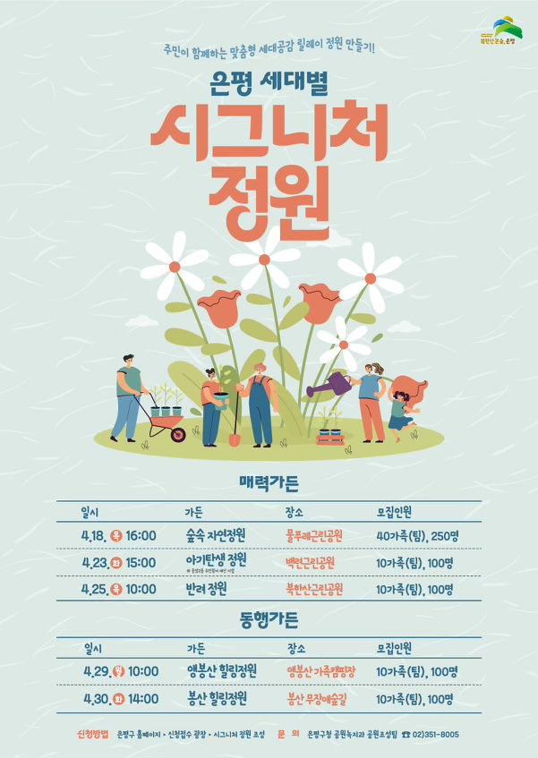 세부 일정을 살펴보면, 18일 물푸레근린공원에서는 청년이 만드는 ‘숲속 자연정원’을, 23일에는 백련근린공원에서 신생아(0~2세)를 위한 ‘아기탄생 정원’을, 25일에는 북한산글린공원에서 전 연령이 함께하는 주민들을 위한 ‘반려정원’을 조성한다.