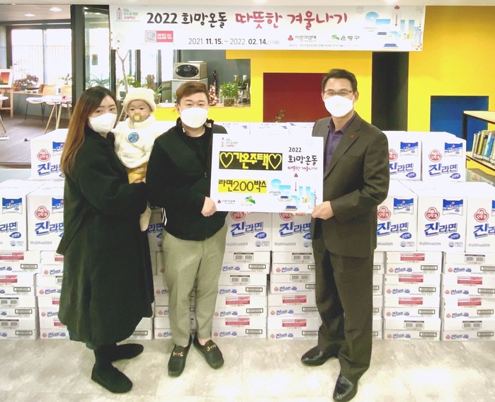 은평구 응암1동 주민센터는 최근 가온주택으로부터 215만원 상당의 라면 200상자를 후원받았다. 사진은 기탁식에서 관계자들이 기념촬영을 하는 모습. (사진제공=은평구청)