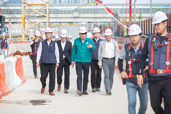 이날 강 청장은 근로 현장을 직접 살피며 신세계 프라퍼티 및 신세계 건설 관계자에게 안전사고에 특히 주의해달라고 당부했다. 이어 공사 진행 현황과 향후 계획을 보고받고 공사가 당초 계획된 시기에 차질 없이 진행될 수 있도록 공정 관리에 힘써달라고 전했다.