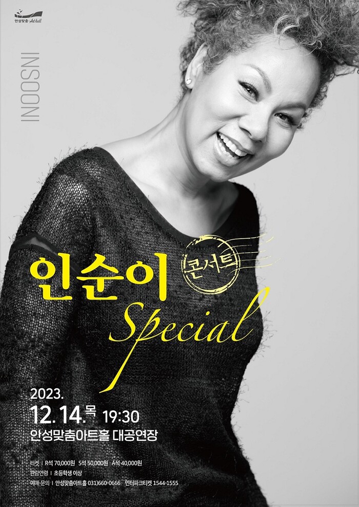 KBS 2TV 예능 프로그램 ‘골든걸스’를 통해 새로운 영역에 도전하는 모습으로 다시 대중을 만나고 있는 인순이의 열정적인 무대와 그녀가 걸어온 삶의 이야기까지 만나볼 수 있는 이번 공연의 티켓가는 R석 7만 원, S석 5만 원, A석 4만 원이며 안성 시민은 15% 할인 혜택을 받을 수 있다. 공연에 대한 자세한 정보는 안성맞춤아트홀 홈페이지를 참고하거나 안성맞춤아트홀로 문의하면 된다.