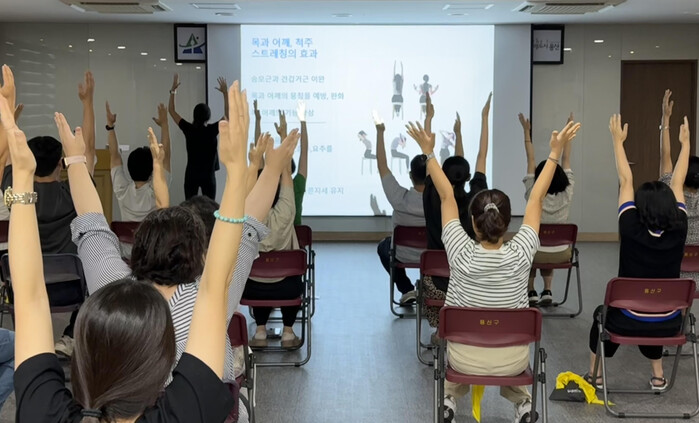 | ▲ 프로그램에 참가한 용산구 사무직 종사자들이 근골격계 질환 예방 운동을 하고 있다. (사진=용산구청 제공) |