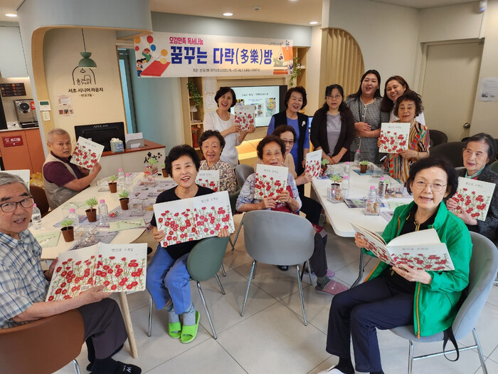 지난 6월26일 진행된 1회차 행사는 노인 10여명이 참석한 가운데 이신자 창의책 놀이지도사의 강의로 시작됐다. 참여자들은 현장에서 그림책 ‘빨간 꽃 초록 잎’을 읽고 각자의 감상을 주고받은 다음, 유리 용기에 식물을 옮겨심는 ‘테라리움’ 체험활동을 했다.