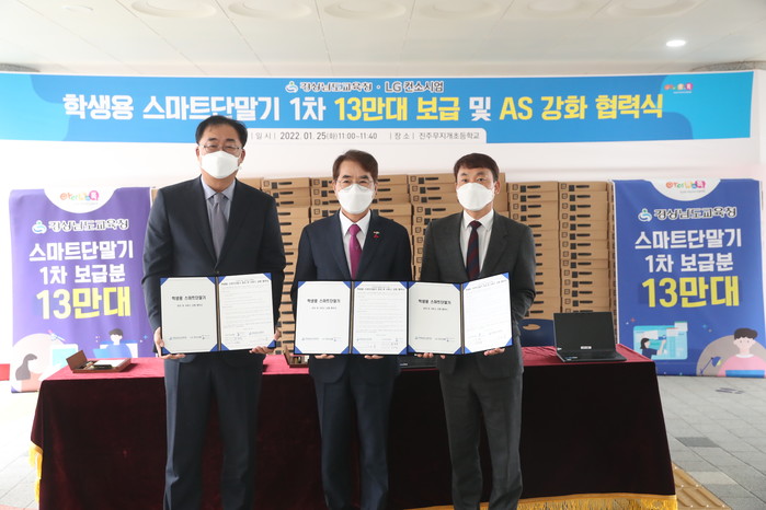 경상남도교육청(교육감 박종훈)은 LG컨소시엄(LG헬로비전 대표 송구영, BK시스템즈 대표 손규열)과 25일 진주 무지개초등학교에서 학생용 스마트단말기 전달식과 신속한 보급 및 사후관리(AS) 지원센터 구축 등을 위한 AS 강화 협력식을 열었다.