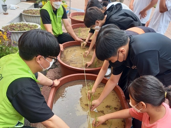 서울 금천구가 최근 학교급식 친환경쌀 공급업체와 체험활동 신청 학교를 연계해 4개 초등학교(문교초·문성초·영남초·금천초)에서 초등학생 428명을 대상으로 ‘농촌체험활동 모내기 행사’를 개최했다. 사진은 문교초등학교에서 진행된 농촌체험활동 모내기 행사에서 학생들이 ‘미니 답(畓)’에 모내기를 하고 있는 모습. (사진제공=금천구청)