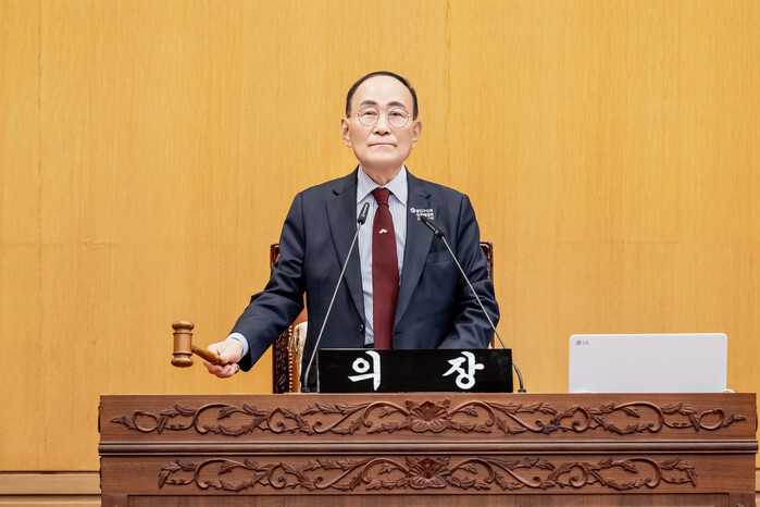 | ▲ 추윤구 의장이 제267회 임시회 제1차 본회의를 진행하고 있다.(사진=광진구의회 제공) |