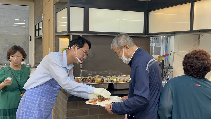| ▲ 정명근 화성특례시장이 26일 동탄치동천종합사회복지관 어르신들에게 점심식사 배식 봉사를 하고 있다 /사진제공=화성특례시 |