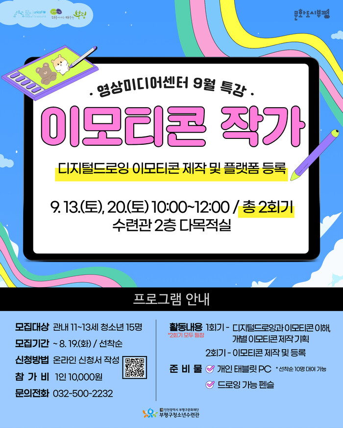 [인천=문찬식 기자] 인천 부평구(구청장 차준택) 청소년수련관은 영상미디어센터 9월 일일특강 ‘이모티콘 작가’의 참가자를 오는 19일까지 모집한다.