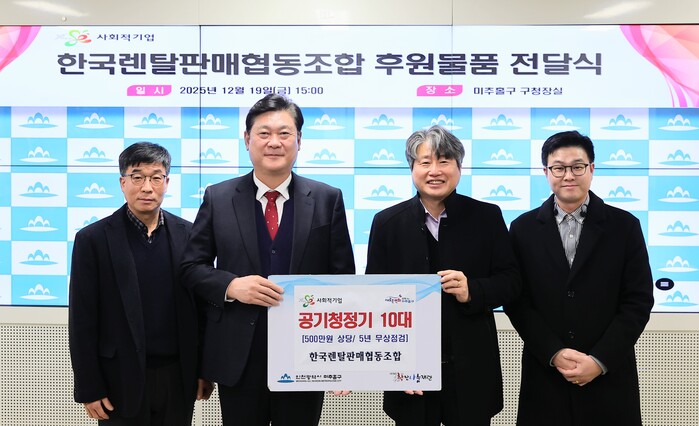 [인천=문찬식 기자] 인천 미추홀구(구청장 이영훈)는 최근 사회적기업 한국렌탈판매협동조합(대표 정영이)으로부터 공기청정기 10대를 전달받았다.