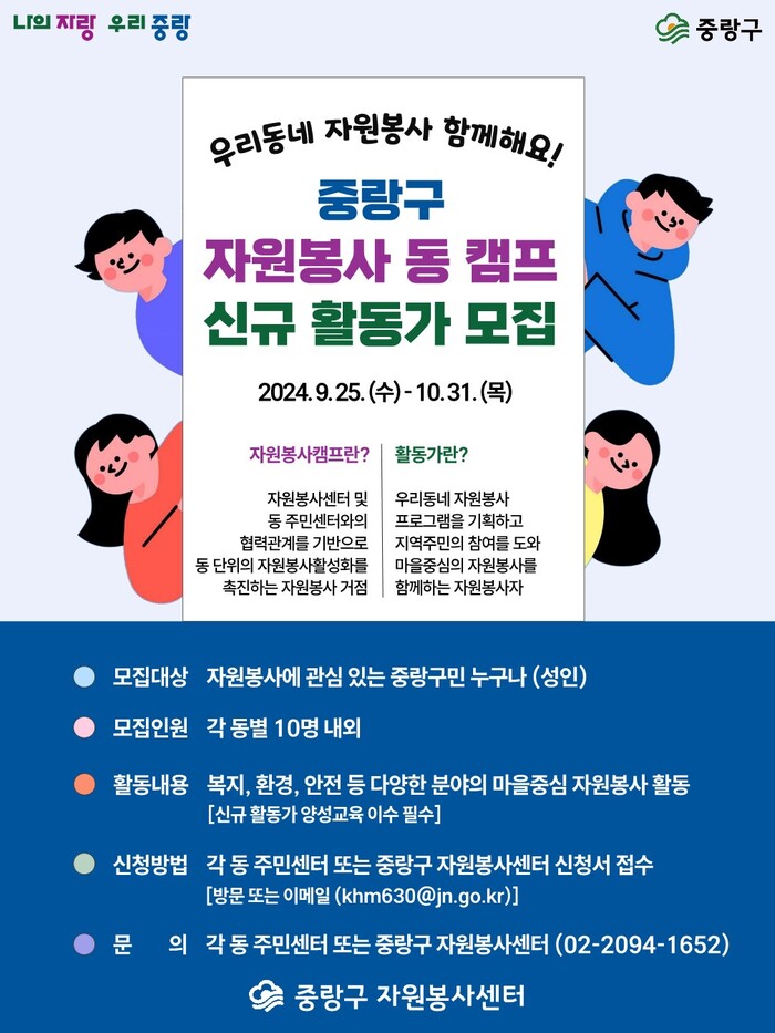 [시민일보 = 여영준 기자] 중랑구(구청장 류경기)가 오는 31일까지 우리동네 자원봉사를 함께할 자원봉사 동 캠프 신규활동가를 모집한다.
