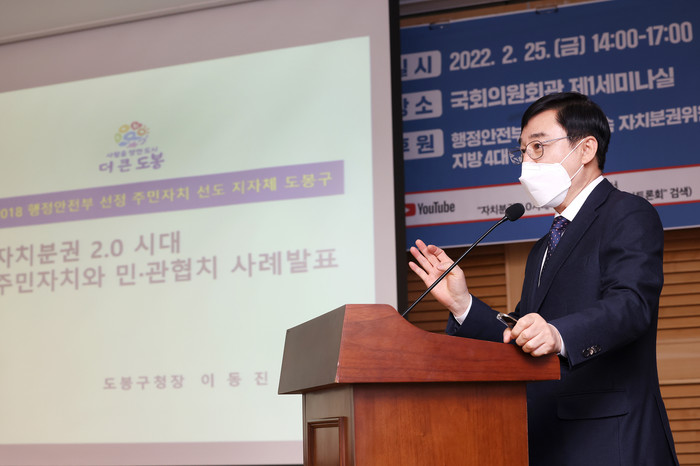 | ▲ 도봉구 ‘자치분권 2.0시대 주민자치와 민관협치’ 사례를 발표 중인 이동진 구청장. (사진제공=도봉구청) |