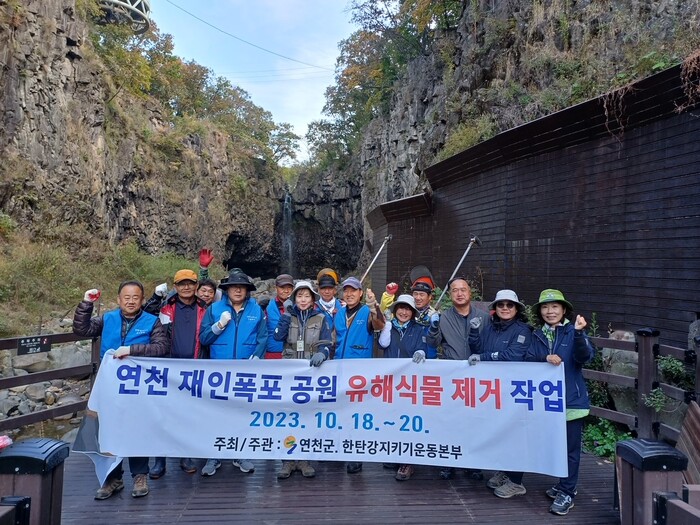 [연천=조영환 기자] 경기 연천군이 18일 임진강 생물권보전지역의 핵심구역이자 한탄강 유네스코 세계지질공원의 대표명소인 재인폭포를 비롯해 임진강 주상절리 등 지역내 관광명소 유해식물 제거 작업을 실시했다.