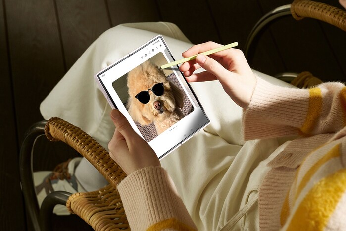 | ▲ 삼성전자 모델이 '갤럭시 Z 폴드6'으로 간단한 스케치를 정교한 AI 이미지로 변환하는 '스케치 변환(Sketch to image)' 기능을 시연하고 있다.(사진=삼성전자 제공) |
