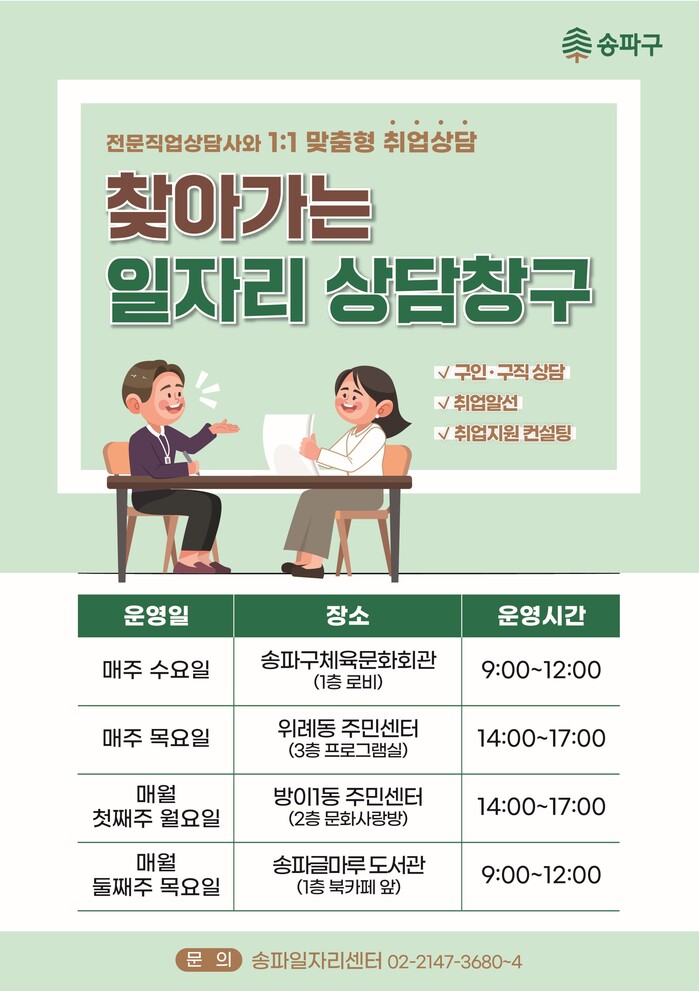 구는 오는 12월 말까지 ▲위례동 주민센터 ▲방이1동 주민센터와 ▲송파체육문화회관 ▲송파글마루도서관 총 4곳에서 ‘찾아가는 일자리 상담 창구’를 운영한다.