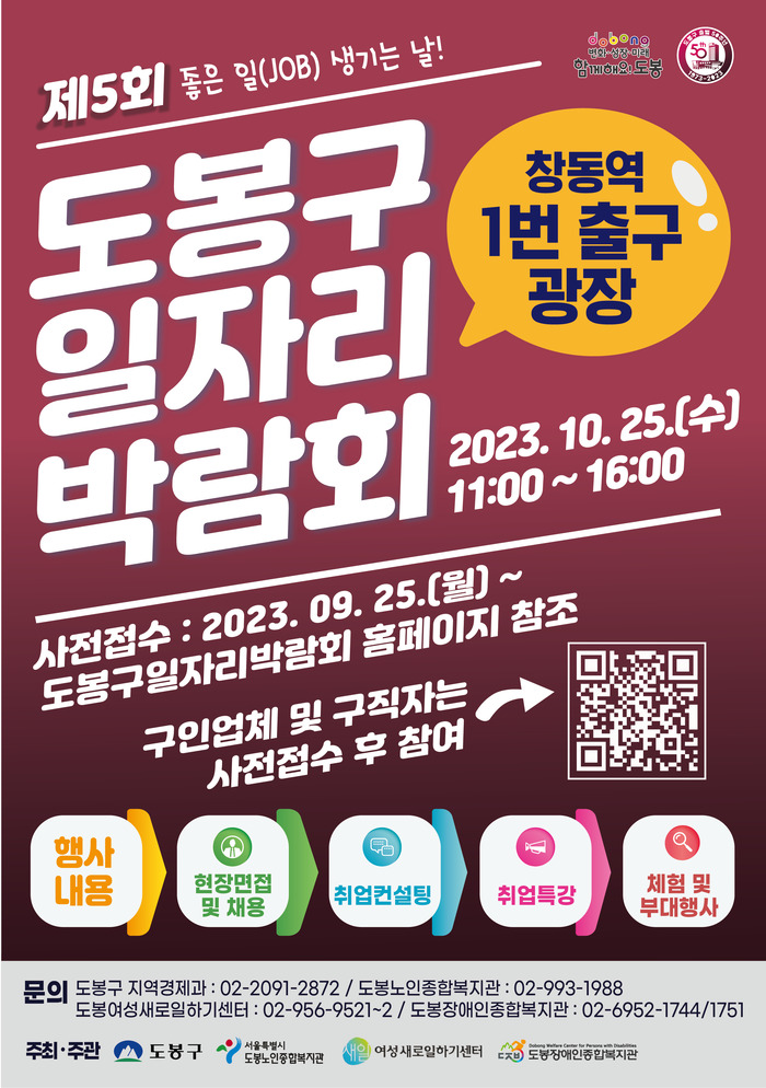 [시민일보 = 여영준 기자] 도봉구(구청장 오언석)는 구직에 어려움을 겪는 구민들을 위해 오는 10월25일 오전 11시~오후 4시 창동역 광장(1번 출구) 일대에서 ‘2023 제5회 도봉구 일자리 박람회’를 개최한다고 밝혔다.
