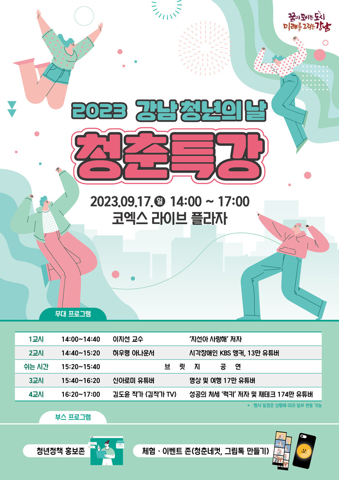 이번 행사는 강남구에서 처음 열리는 청년 축제다. 청년들의 목소리를 경청하고 정책에 반영하기 위해 청년들이 직접 정책을 제안하는 ‘청정보호구역’과 청년에게 희망과 감동을 주는 ‘릴레이 청춘 특강’을 준비했다.