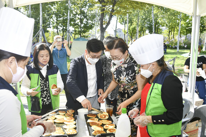 | ▲ 김병수 김포시장이 한강중앙공원에서 열린 ‘2022년 제15회 김포 세계인 큰잔치’ 행사에 참석, 중국 국가 문화 체험부스에서 전통음식 만들기에 참여하고 있다.(사진제공=김포시청) |