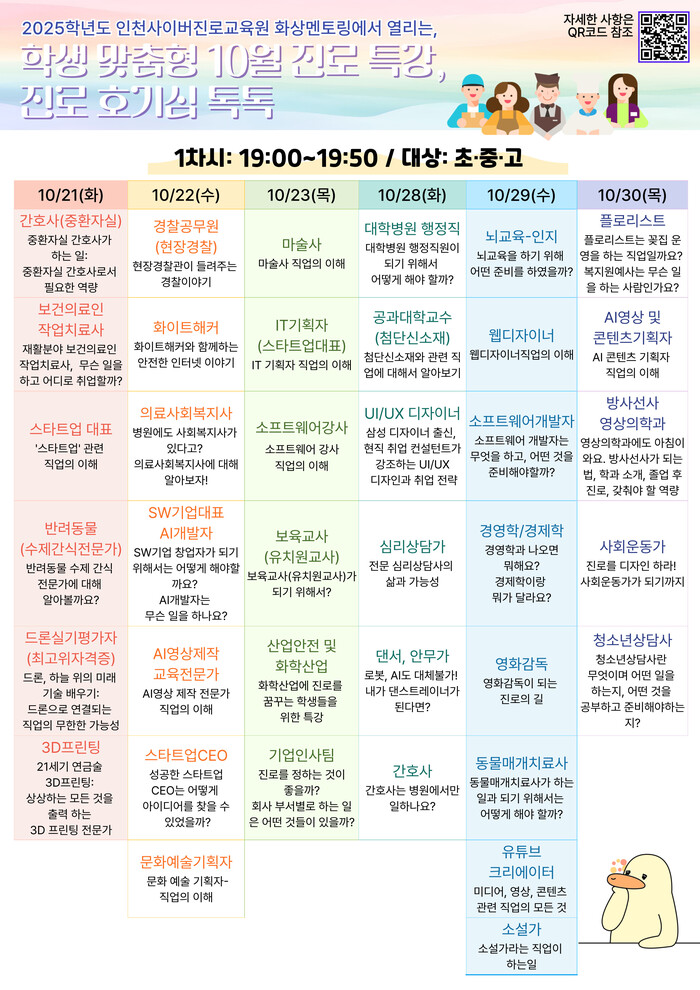 강의는 오후 7시와 8시 두 차시로 진행되며, 인천시교육청 진로·직업 멘토단 2,000명이 강사로 참여해 초·중·고 학생들에게 생생한 진로·직업 정보를 제공한다.