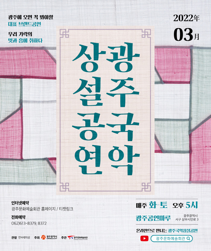 ‘광주다움’을 담은 전통을 기반으로 다양한 장르의 공연을 선보이며 브랜드 공연의 기틀을 마련하고 지속가능한 공연을 만들고자 노력하고 있는 광주국악상설공연이 2022년 민간예술단체 공모 사업을 추진한다. 이번 사업을 통해 선정된 단체는 4월부터 다채로운 공연을 선보일 예정이다.