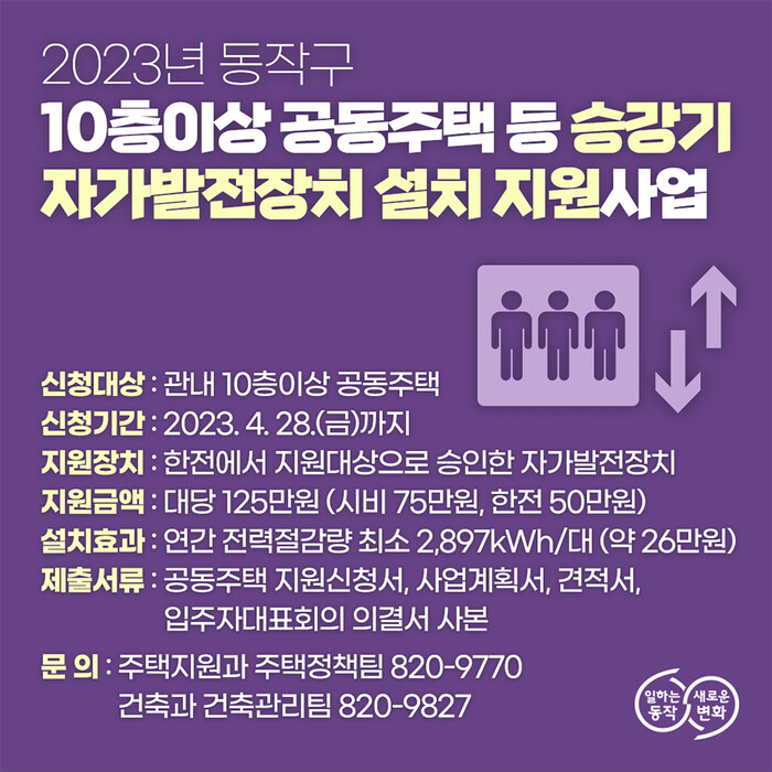 [시민일보 = 여영준 기자] 서울 동작구(구청장 박일하)는 오는 28일까지 공동주택 등의 전기료 및 온실가스를 줄일 수 있는 ‘승강기 자가발전장치 설치 지원 사업’ 신청자를 모집한다고 19일 밝혔다.