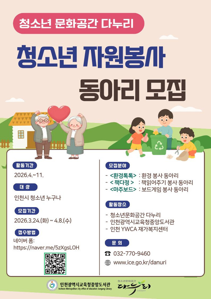 [인천=문찬식 기자] 인천광역시교육청중앙도서관(관장 임현자) 청소년문화공간 ‘다누리’는 3월 24일부터 4월 8일까지 인천 관내 청소년을 대상으로 자원봉사 동아리 참여자를 모집한다.
