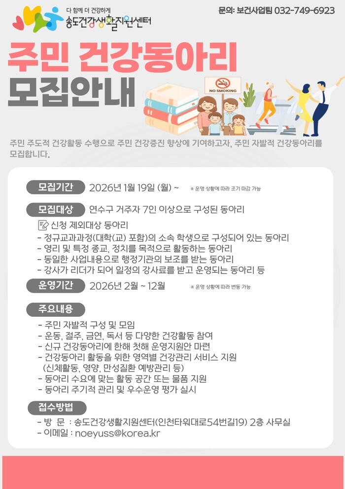 [인천=문찬식 기자] 인천 연수구(구청장 이재호) 송도건강생활지원센터는 주민들의 자발적인 건강 증진 활동을 지원하기 위해 오는 19일부터 ‘주민 참여형 건강동아리’를 모집한다.