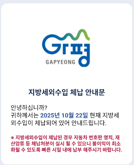 군 관계자는 “이번 카카오톡 모바일 전자고지 서비스로 납세 편의성이 개선되고, 체납 징수율 향상에 기여할 것으로 기대된다”며 “체납자들의 기한 내 자진 납부를 부탁드린다”고 말했다.