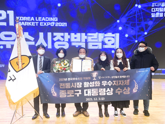 서울 종로구가 최근 중소벤처기업부 주최 ‘2021년 전국우수시장박람회’에서 ‘전통시장 및 상점가 활성화 우수기관’으로 선정돼 대통령상의 영예를 안았다. 구는 전국 지방자치단체 중 5번째, 서울시에서는 유일하게 대통령상을 받으며 노력을 인정받았다.사진은 시상식에서 구 관계자들이 기념촬영을 하고 있는 모습. (사진제공=종로구청)