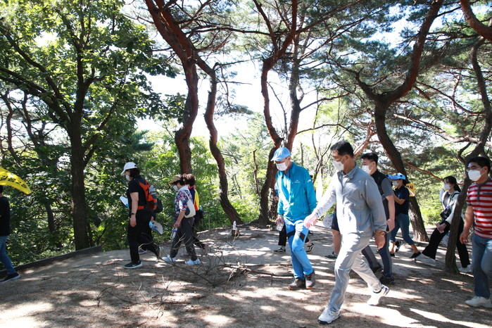 서울 성북구 걷기 대회가 코로나 확산에 따라 중단됐다가 2년 반 만에 지난 27일 성북구 개운산둘레길 일대에서 열렸다. 이번 행사는 걷기대회뿐 아니라 금연클리닉 상담 등 다채로운 건강부스 체험과 경품행사까지 열려 시민들의 활발한 참여를 끌어냈다. 사진은 이승로 구청장이 시민들과 개운산 둘레길을 걷고 있는 모습. (사진제공=성북구청)