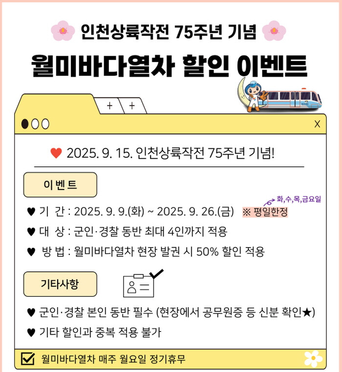 군·경 본인이 신분증(공무원증 등)을 제시하는 한편 월미바다열차 티켓을 현장에서 구매하면 본인 포함 최대 4명까지 50% 할인 혜택을 받을 수 있다.