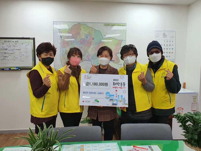 서울 은평구 불광2동은 최근 불광2동 자원봉사캠프·은평나눔플러스로부터 지역 취약계층을 위한 따뜻한 겨울나기 성금 118만원을 전달받았다. 사진은 전달식에서 관계자들이 기념촬영을 하는 모습. (사진제공=은평구청)