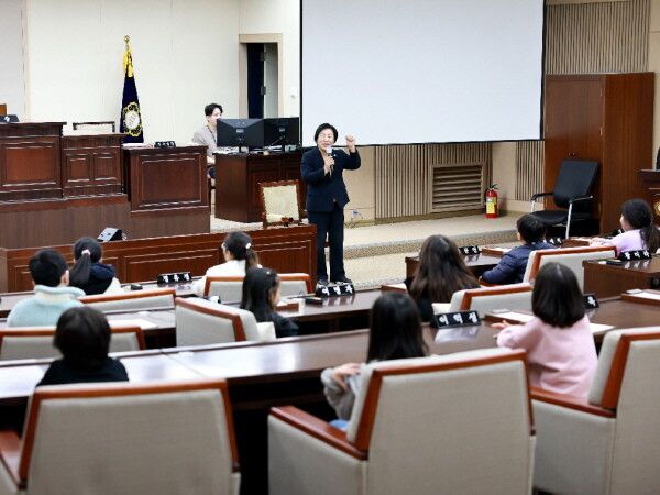| 홍순옥 의장이 동초등학교 학생들에게 지방의회에 대해 설명하고 있다. |