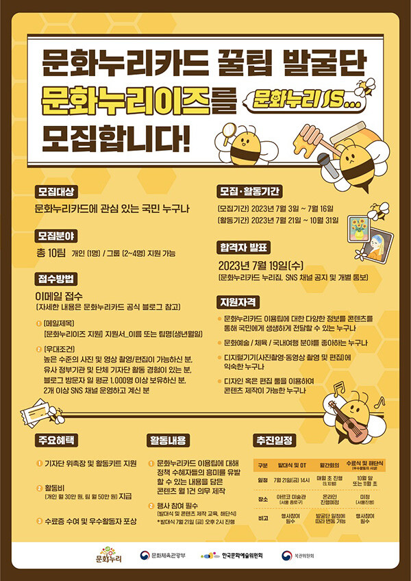 지원 신청은 문화누리카드 누리집 또는 대표 블로그 게시물에서 지원서 서식을 다운받아 작성 후 운영사무국 이메일로 제출하면 된다. 지원서, 콘텐츠 제안, 포트폴리오를 포함한 서류 심사를 거쳐 최종 선발되며 7월 21일 금요일 진행되는 발대식은 필수 수료 기준에 해당된다. 자세한 사항은 문화누리카드 대표 블로그에서 확인할 수 있다.
