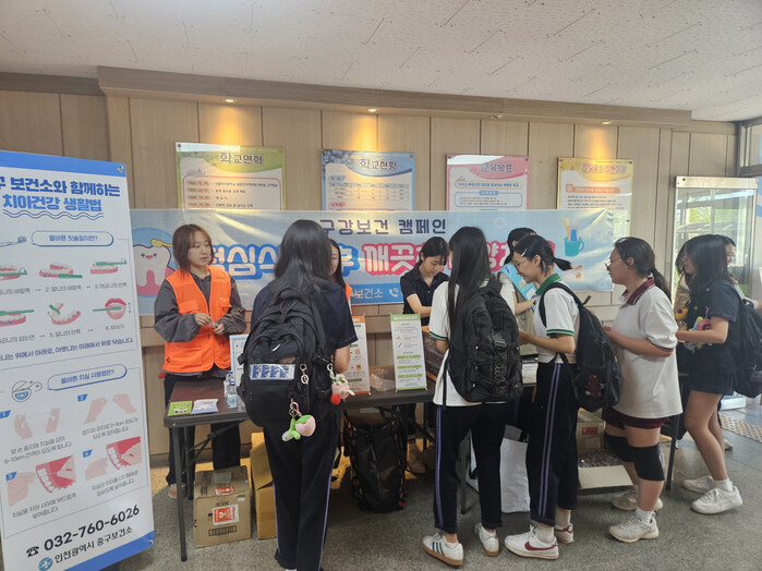 [인천=문찬식 기자] 인천 중구(구청장 김정헌)는 지난 10일 아침 신흥여자중학교에서 등교 시간에 맞춰 ‘구강건강 캠페인’을 열고, 점심 식사 후 양치 습관을 실천할 수 있도록 격려하는 활동을 펼쳤다.