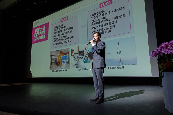 | ▲ 올해 1월 신년인사회에서 공항소음대책지역 지원확대 방안에 대해 설명 중인 이기재 구청장. (사진=양천구청 제공) |