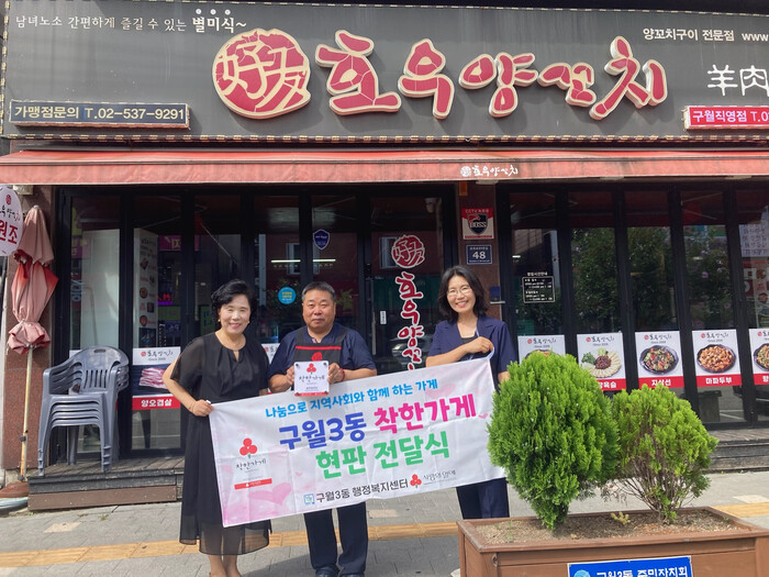 [인천=문찬식 기자] 인천 남동구 구월3동 지역사회보장협의체(위원장 주영미)는 최근 착한 가게에 가입한 호우양꼬치(대표 이해영)에 인증현판을 전달했다고 전했다.