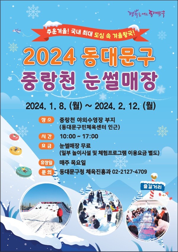이필형 동대문구청장은 “겨울 방학을 맞은 어린이들이 가족들과 중랑천 눈썰매장에서 즐거운 추억을 만들기를 바라며, 안전을 최우선으로 하여 풍성한 겨울철 즐길 거리를 제공하겠다”고 밝혔다.