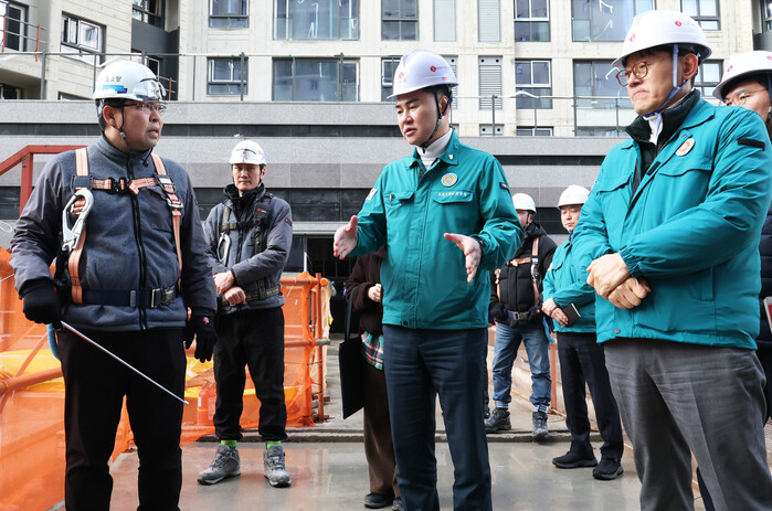 | ▲ 오언석 구청장(가운데)이 지역내 대형공사장을 찾아 현장 관계자에게 근로자 안전관리 준수 등을 강조하고 있다. (사진= 도봉구청 제공) |