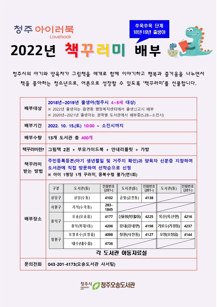 청주시 권역별 공공도서관 13개관(오송, 흥덕, 신율봉, 강내, 옥산, 가로수, 상당, 청원, 오창호수, 오창, 금빛, 내수, 기적의도서관)은 15일 오전 10시부터 3단계 ‘쑤욱쑤욱’ 책꾸러미 400부를 4세~5세(2018년생~2019년생) 유아들을 대상으로 동시에 배부한다.