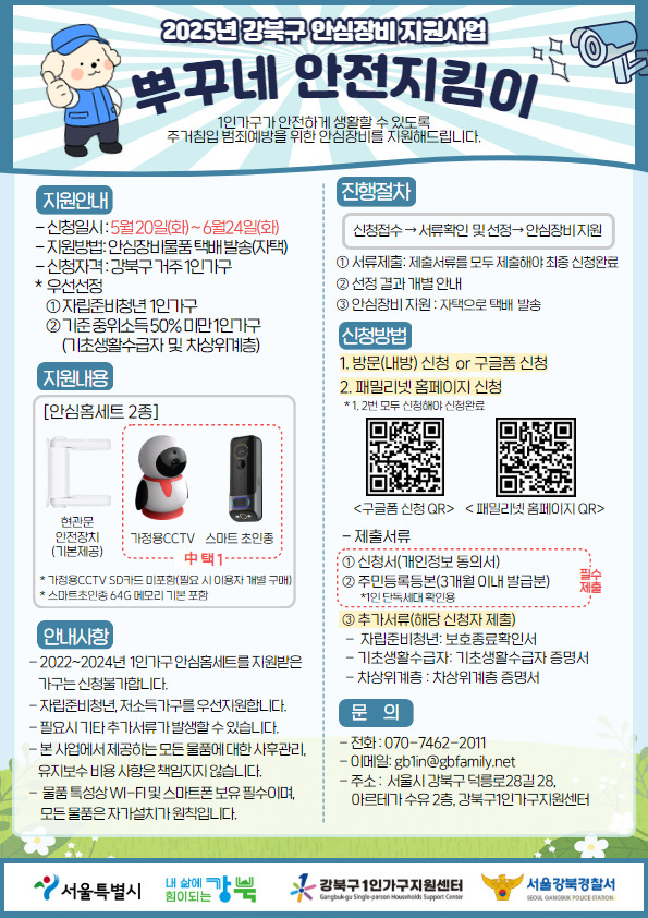 신청 기간은 오는 24일까지이며, 신청을 희망하는 1인가구는 강북구 1인가구지원센터(덕릉로28길 28, 2층)를 방문하거나 포스터 내 QR코드를 통해 구글폼 신청 후, 패밀리넷 홈페이지에서도 신청을 완료해야 한다.