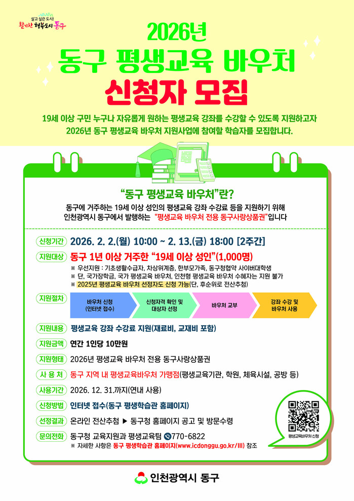 [인천=문찬식 기자] 인천 동구(구청장 김찬진)는 오는 2월 2일부터 ‘2026년 동구 평생교육 바우처’ 신청자를 모집한다고 밝혔다.