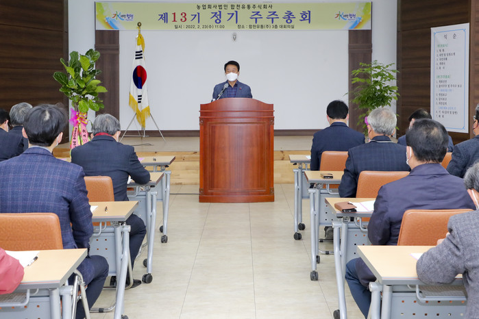 농업회사법인 합천유통(주)(대표 장문철)은 23일 합천유통 대회의실에서 문준희 합천군수, 배몽희 합천군의회의장, 김윤철 경상남도의원, 신재순 농업기술센터소장, 군의원, 관계기관 및 사회단체장, 주주 등 30여 명이 참석한 가운데 코로나19 방역수칙을 준수하며 제13기 정기 주주총회를 개최했다.