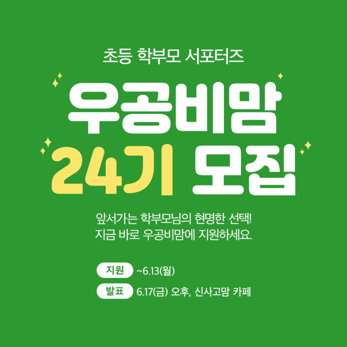 좋은책신사고 관계자는 “초등 학부모님들의 평가와 다양한 의견을 적극적으로 반영하기 위해 2011년부터 꾸준히 우공비맘 서포터즈를 운영하고 있다”면서 “우공비 교재를 체험할 수 있을 뿐 아니라 서포터즈 간 다양한 교육 정보를 나누고 소통할 수 있는 우공비맘 24기에 많은 관심 바란다”고 말했다.