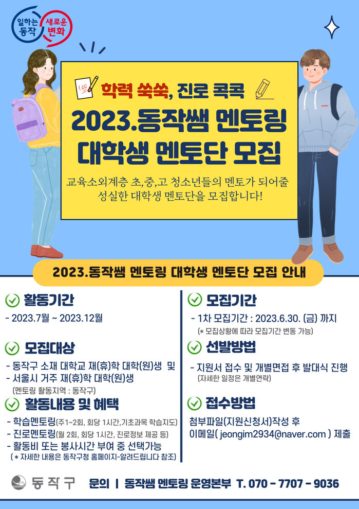 [시민일보 = 여영준 기자] 서울 동작구(구청장 박일하)는 교육취약계층의 학습격차 해소를 위한 ‘학력 쑥쑥, 진로 콕콕 2023 동작쌤 멘토링’을 오는 7월부터 운영한다고 22일 밝혔다.
