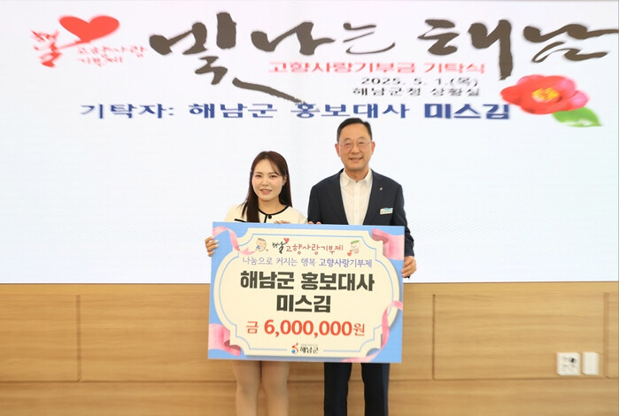 TV조선 미스트롯3 출연자로 활약한 해남 황산면 출신의 미스김은 고향사랑기부금 600만 원을 기탁하며 고향사랑의 마음을 전했다.