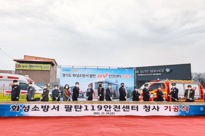 원유민 경기 화성시의회 의장과 조오순, 최청환 의원이 최근 열린 팔탄119안전센터 기공식에 참석해 안전센터 건립 공사의 시작을 축하했다. 사진은 기공식에 참여한 원 의장(왼쪽 일곱 번째)가 시삽을 하고 있는 모습. (사진제공=화성시의회)