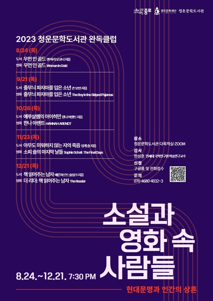 강의는 한성훈 연세대 국학연구원 학술연구교수가 맡았다. 총 5회차 프로그램으로 구성됐으며 ▲1강 구스타프 클림트의 걸작에 관한 이야기(책/영화: 우먼 인 골드) ▲2강 수용소를 경계로 만난 두 소년의 우정과 뒤바뀐 운명(책/영화: 줄무늬 파자마를 입은 소년) ▲3강 우리 시대의 가장 독창적인 정치사상가 한나 아렌트의 대표작(책: 예루살렘의 아이히만/영화: 한나 아렌트) ▲4강 모순이 가득한 세상, 당신이라면 어느 자리에 설 것인가?(책: 아무도 미워하지 않는 자의 죽음/영화: 소피 숄의 마지막 날들) ▲5강 파격적인 사랑 속에 나타난 가해자의 윤리에 관한 통찰(책: 책 읽어주는 남자/영화: 더 리더) 순으로 이어진다.