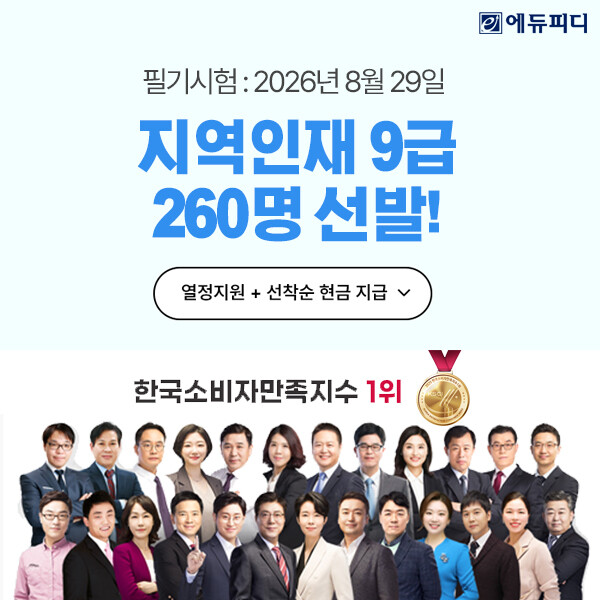 에듀피디의 지역인재 9급 전용 ‘합격패키지’는 직무 중심의 최신 출제 경향을 정밀 분석하여 기초 이론부터 문제 풀이, 기출 해설까지 체계적인 커리큘럼을 제공한다. 빅데이터 분석 시스템을 적용해 핵심 개념 위주의 효율적인 학습이 가능하도록 설계되었으며, 과목별 전문 교수진이 수험생의 눈높이에 맞춘 전략적인 강의를 선보인다.